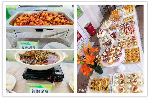 活动开展前期后勤管理与基建处进行了精心策划,并得到教工食堂餐饮承包单位黄山大厦团膳集团KK公司给予的大力支持,餐厅装饰一新,营造出浓烈的美食文化氛围。整个美食展区精美凉菜、风味烧菜、蒸汁菜肴、名点小吃、水果拼盘应有尽有,秀色可餐。两天的活动共计推出了32道美食菜肴,最大程度满足教职工的就餐差异化需求。