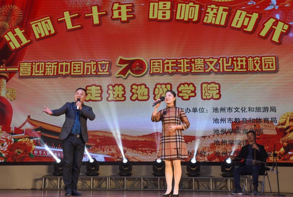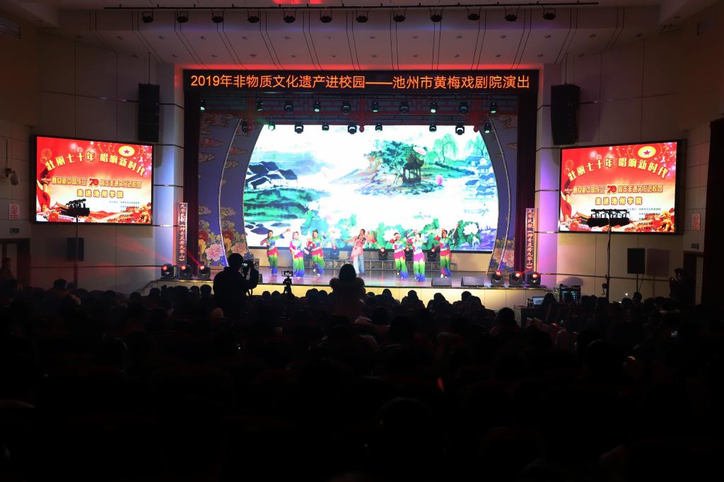 12月26日,2019年非物质文化遗产进校园活动——池州市黄梅戏剧院演出在必赢官网博古礼堂举行,党委委员、宣传部长胡兵和师生代表共同观看演出。